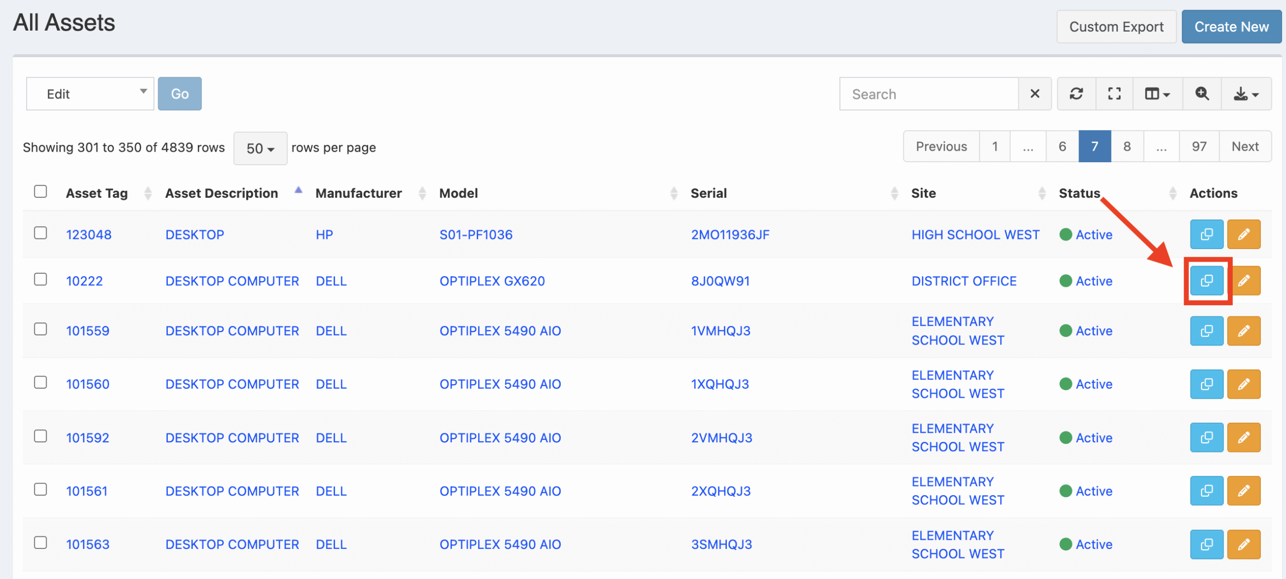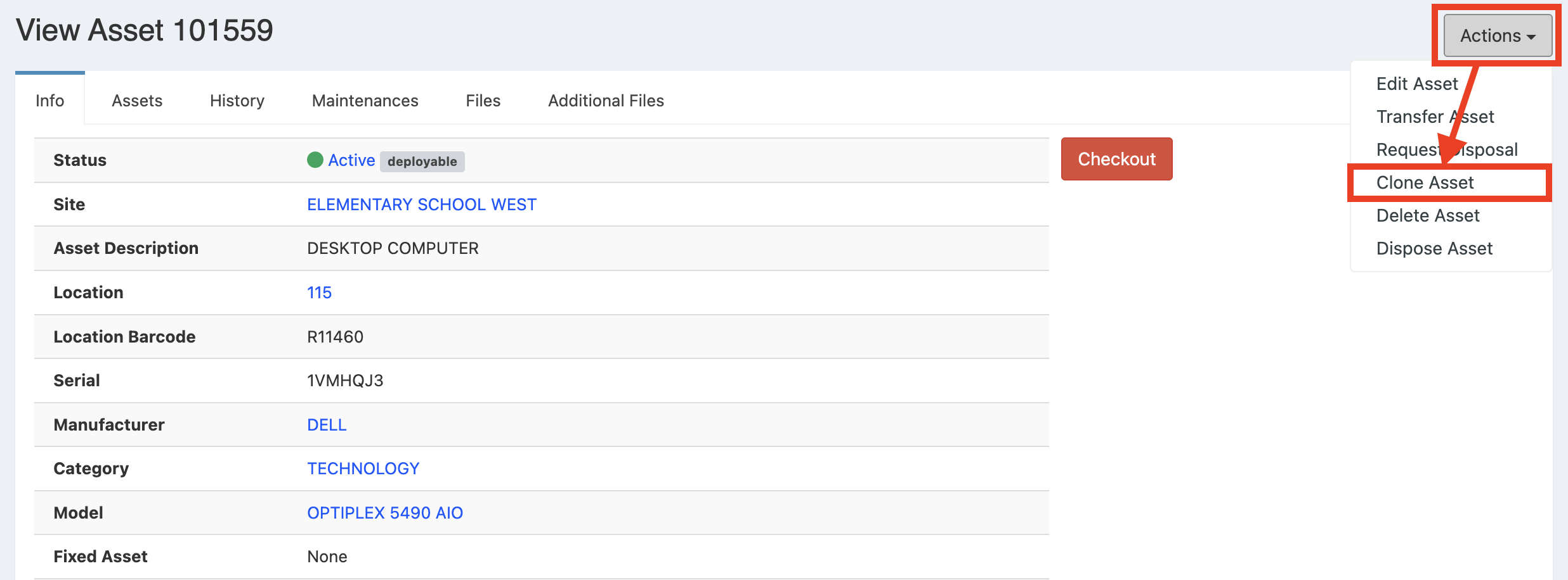 1) You can clone an asset either by clicking on the light blue “clone” button when looking at a list view or by selecting “Clone Asset” from the actions dropdown when looking at a single asset.