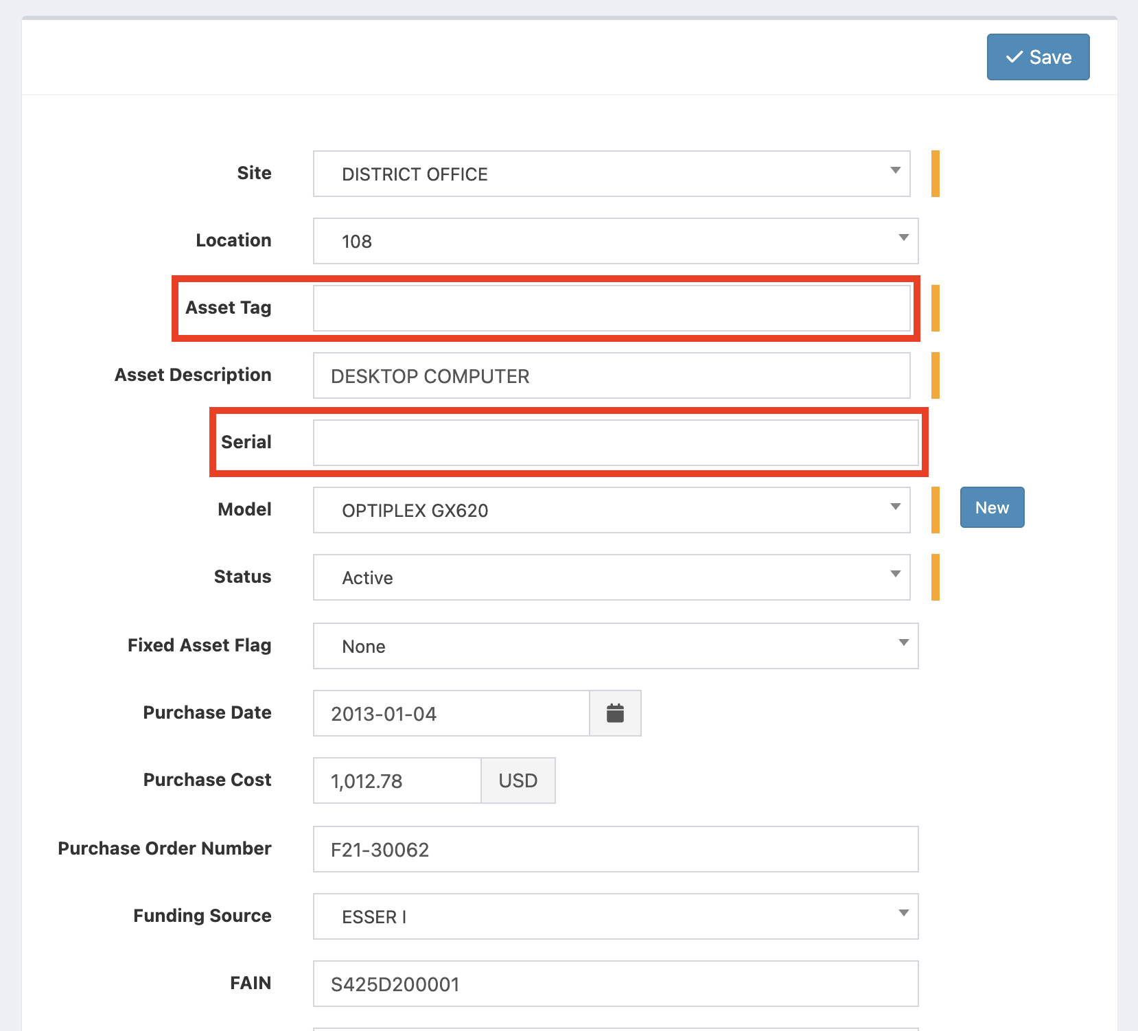 2) After you have clicked on the button to clone an asset, an Add New Asset window will open up that will have identical information except that it will have no values for Asset Tag, Serial Number, and Last Audit Date. You will simply need to add in the Asset Tag and Serial number of the new asset and click “Save”