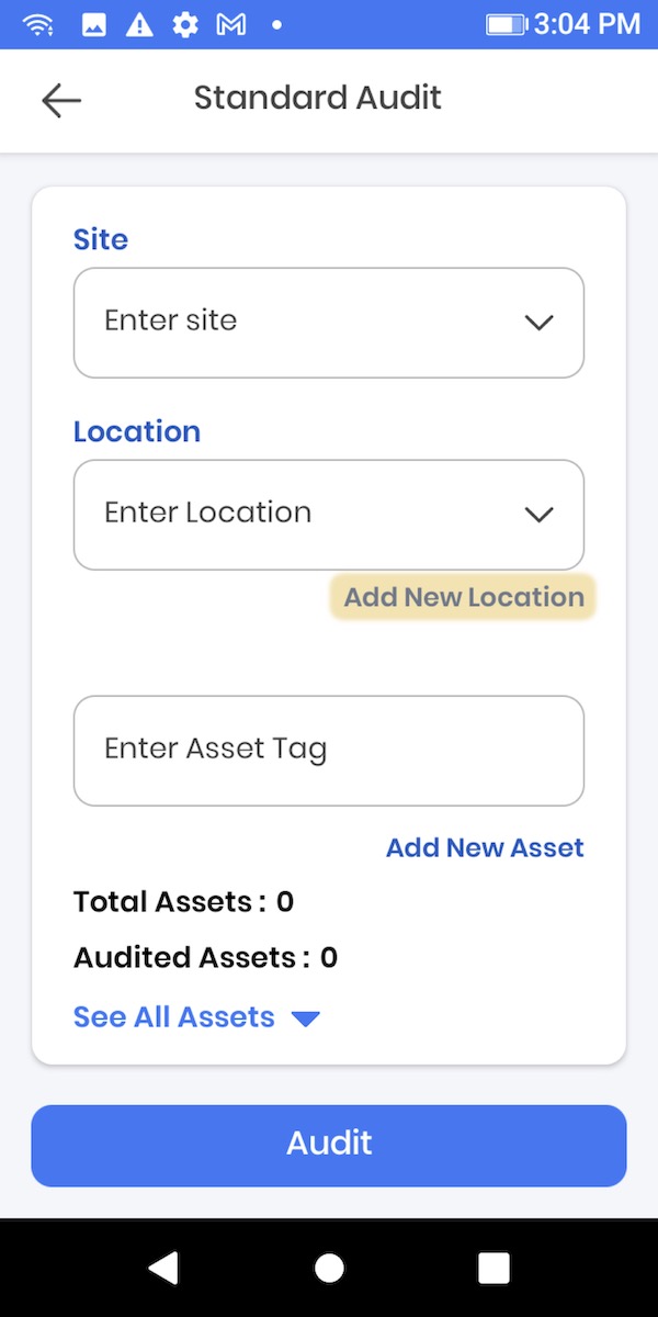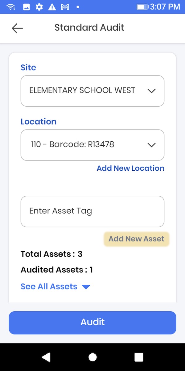 10) If you need to add a new asset during the inventory audit you can click the Add New Asset button and add all the relevant information. The Site/Location will be pre-filled in for you because the scanner already knows your location.