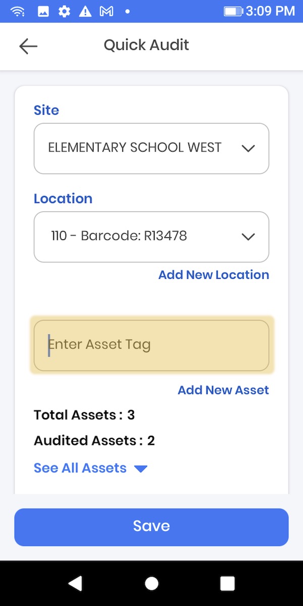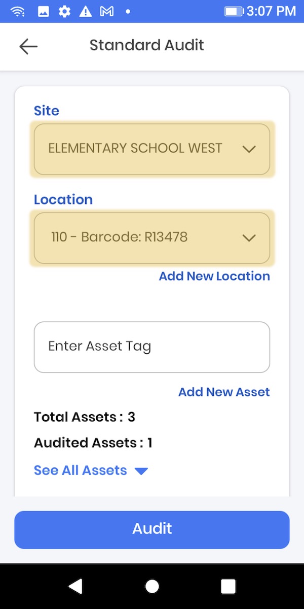 3) Enter the Site and Location that you will be doing the inventory. To find the Location you can tap on the dropdown menu and scroll to the correct Location or you can type in the name of the Location. If your district is using barcode tags on the door you can scan the Room Tag number and then select the Location name.