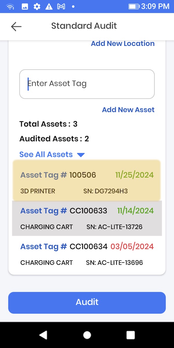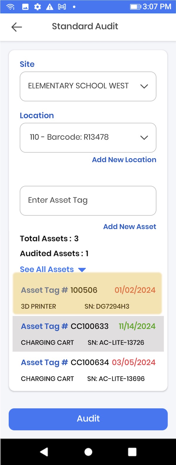 7) You are now ready to scan the next asset and repeat the above steps. You will see the Last Audit Date for the asset you have scanned is now updated as well.