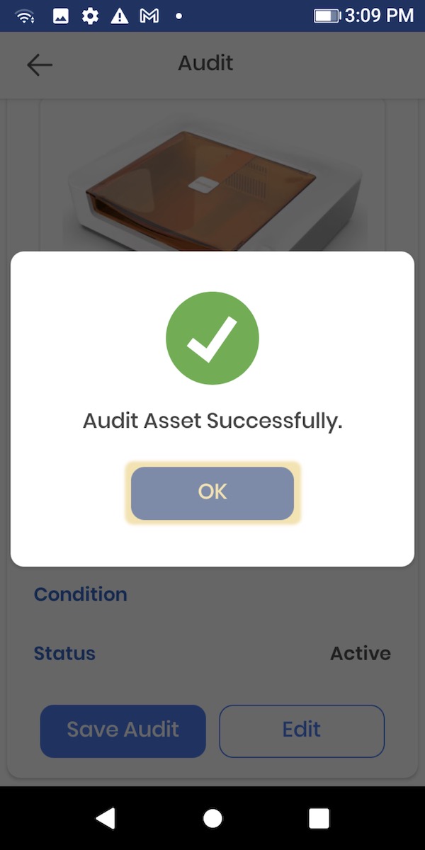 6) You will get a confirmation that the asset has been audited. Click OK.