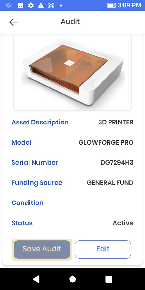 5) After you scan an asset tag it will pull up a summary information card for the asset that you have scanned. If you want to edit any of this information you can click the Edit button and change the data. If you do not need to edit any of the information you can click Save Audit.