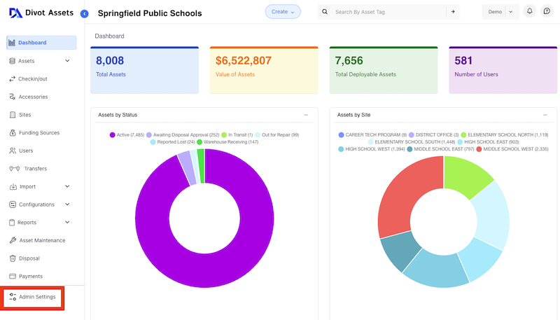 13) You must be signed in to K12 Asset Pro as a Super Admin. Go the the Admin Settings link in the lower left corner of the navigation bar.